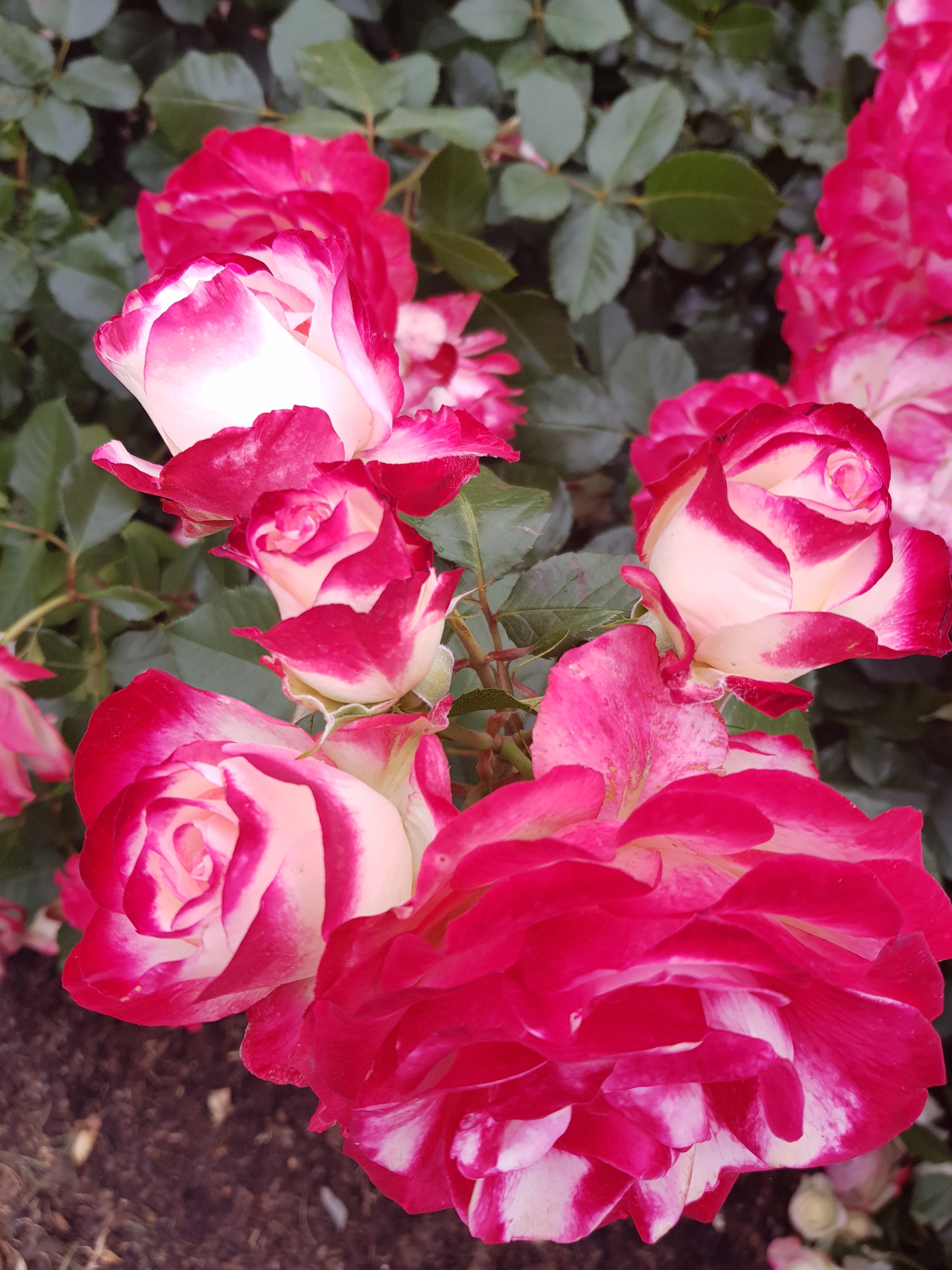 Fire ‘n’ Ice should be widely grown for its immense disease resistance. The foliage is lush and glossy dark green and makes a wonderful foil for the magnificent procession of strong stems of blooms all over the shrub.