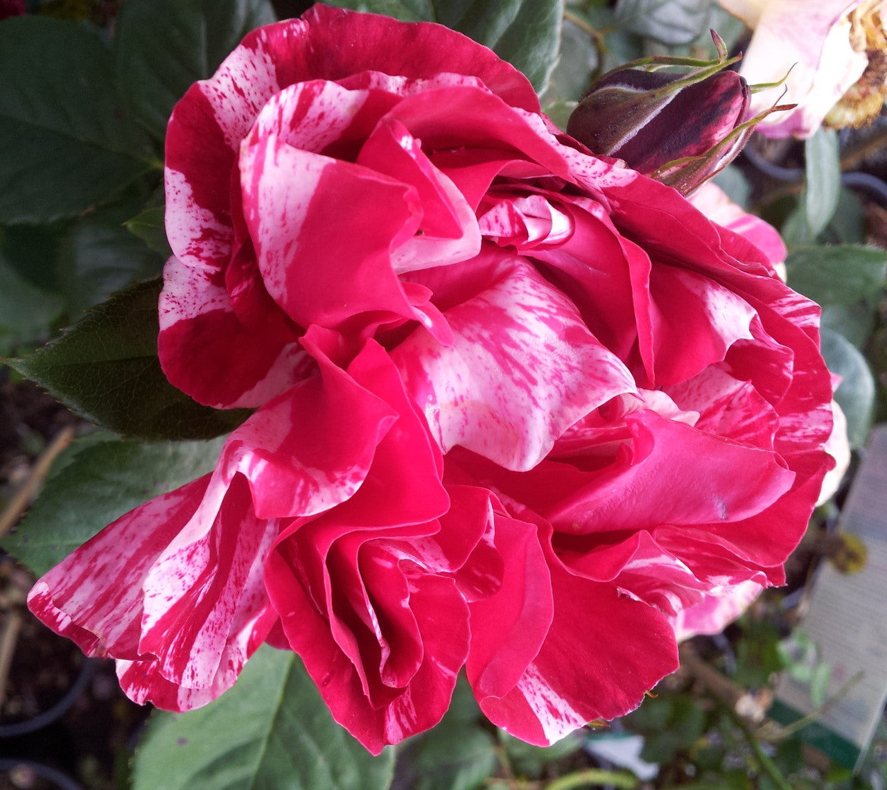 The dark cerise/red petals are slashed with bars of white and no two blooms are identical so the bush in a garden border, growing to around 1metre in height, is a constant reminder of how interesting roses continue to be!