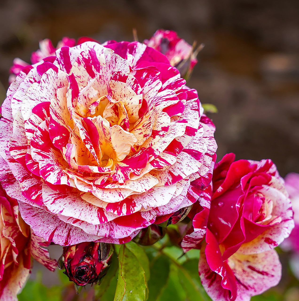 IT'S MAGIC is so delightfully colourful - red stripes with slashes of cream and gold and a sweet, subtle fragrance. This robustly healthy rose has lush foliage and blooms throughout the flowering season very prolifically to create a magical display of riotous colour in your garden.